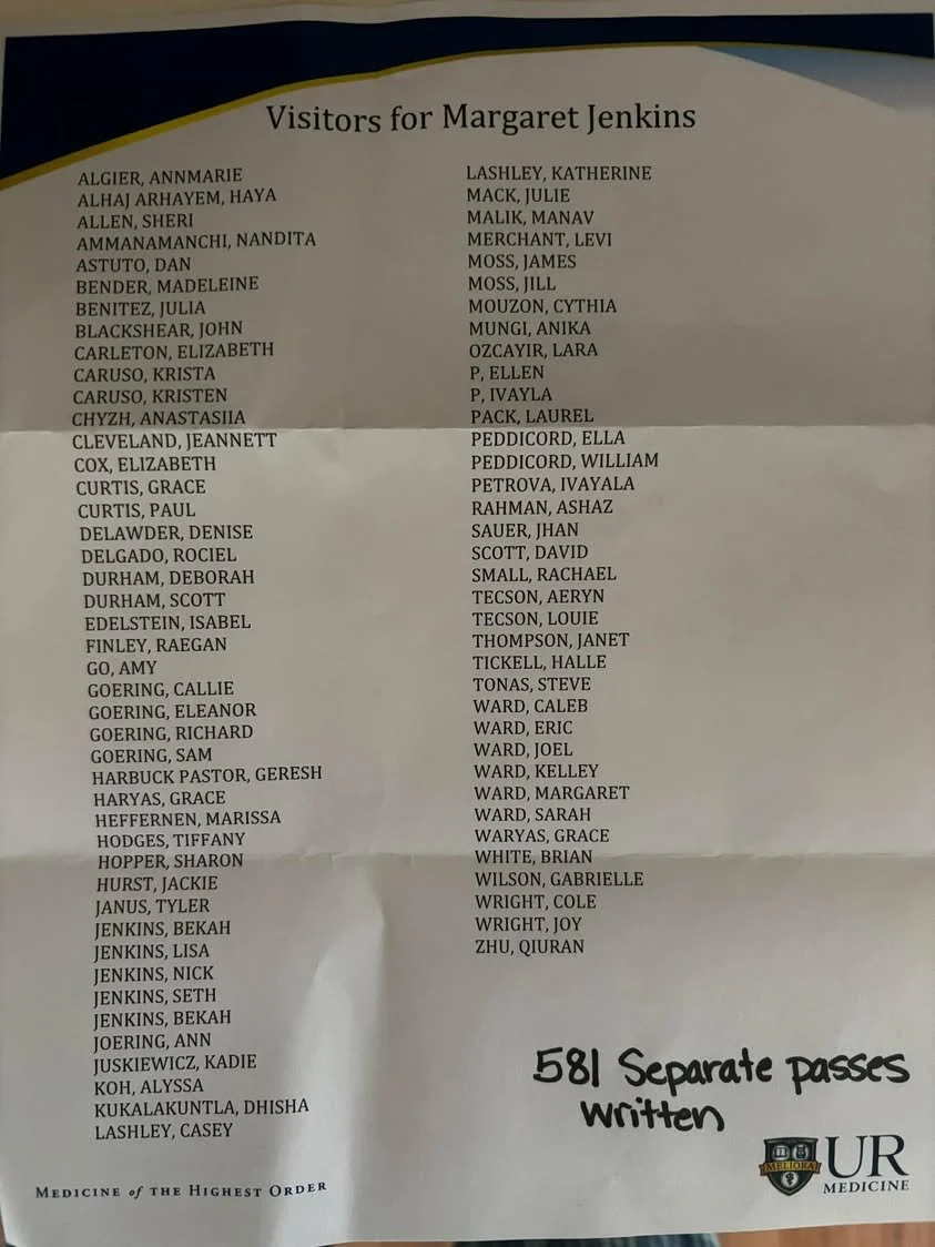 Before we left Strong, I asked the welcome desk for a list of people who had visited Maggie in the 212 days she was admitted. Before you go into the hospital, you have to get a pass. We got to know many of the workers and they always commented on how many names there were and how nice all her visitors were.