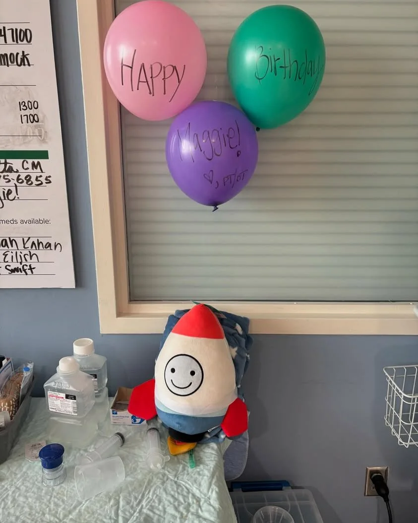 Happy 20th Maggie! Today looks so much different than last year. And I’m glad we didn’t know what was coming. But, you are peaceful and calm and are coming home tomorrow! We’ll celebrate tomorrow! We love you and can’t wait to see all you accomplish this year! Her awesome PT/OT team got her balloons and sang to her. Her sweet PA got her the blanket/pillow. We are so blessed with the people caring for her!